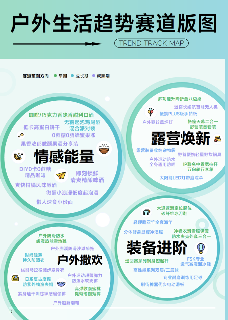 巨量算數(shù) & 算數(shù)電商研究院綜合趨勢賽道評估模型,篩選出了 38 個戶外生活行業(yè)趨勢賽道,覆蓋運動用品、戶外用品、箱包、方便食品、酒飲等多板塊,我們認為推動品類的創(chuàng)新力集中在功能創(chuàng)新、場景創(chuàng)新和情感創(chuàng)新。