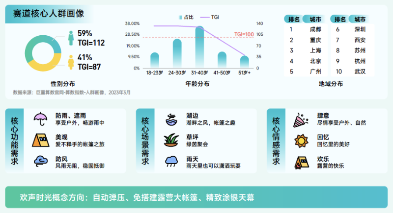 帳篷賽道解讀:該賽道抖音2022年搜索量同比增長228.6%,遠高于行業(yè)整體水平。該賽道的興趣群體以 31-40 歲的男性為主,主要分布地區(qū)涵蓋多個熱門旅游城市。隨著生活水平的提高和對自然休閑需求的增加,多功能帳篷在未來將更受歡迎,防雨、美觀和防風(fēng)等多重特性將滿足人們對于舒適和便利的需求。除此之外,在技術(shù)創(chuàng)新、多樣化產(chǎn)品、個性化定制、環(huán)??沙掷m(xù)發(fā)展等趨勢上,這一領(lǐng)域?qū)⒂袕V闊的市場前景。