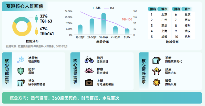 防曬衣賽道解讀:搜索量同比增長 161.4%,遠高于行業(yè)整體,該賽道上半年搜索量逐漸上升,下半年搜索量逐漸下降,6月份搜索量最高。興趣群體以女性為主,31-40 歲人群占比高,用戶集中在一線和高溫天氣多發(fā)城市。未來,防曬衣可能會更加注重輕盈防曬、持久等功能,為消費者提供更好的防護和穿著體驗,并向輕薄、智能等方向發(fā)展。
