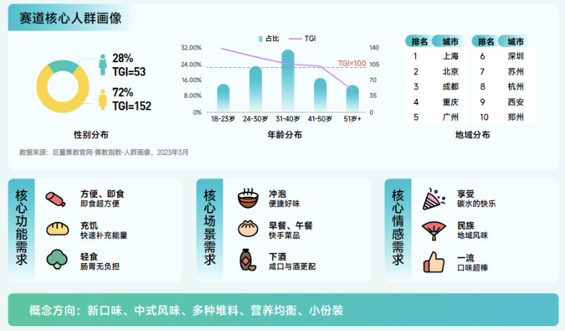 方便食品賽道解讀:2022年3月-2023年4月間搜索量同比增長 829.6%,遠高于行業(yè)整體,月度趨勢波動攀升。女性為主,31-40 歲人群占比高;集中在一二線城市。方便食品由于其便宜、快速和方便,逐漸成為出行必備品。正所謂,方便生活,小包裝,大營養(yǎng)。在戶外出行中,方便食品助你享受更加自由、無拘束的旅程。