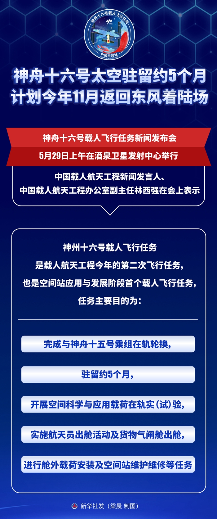 新華社酒泉5月29日電 神舟十六號載人飛行任務(wù)新聞發(fā)布會5月29日上午在酒泉衛(wèi)星發(fā)射中心舉行。中國載人航天工程新聞發(fā)言人、中國載人航天工程辦公室副主任林西強(qiáng)在會上表示,神舟十六號載人飛船駐留約5個月,計劃于今年11月返回東風(fēng)著陸場。