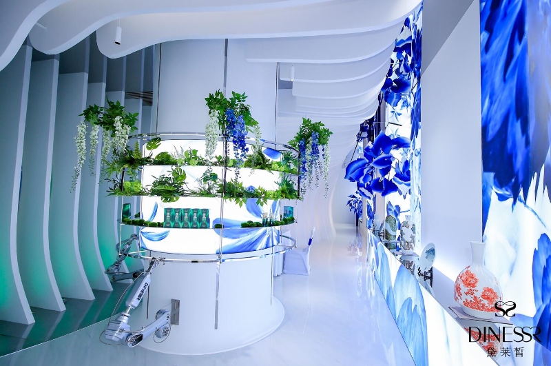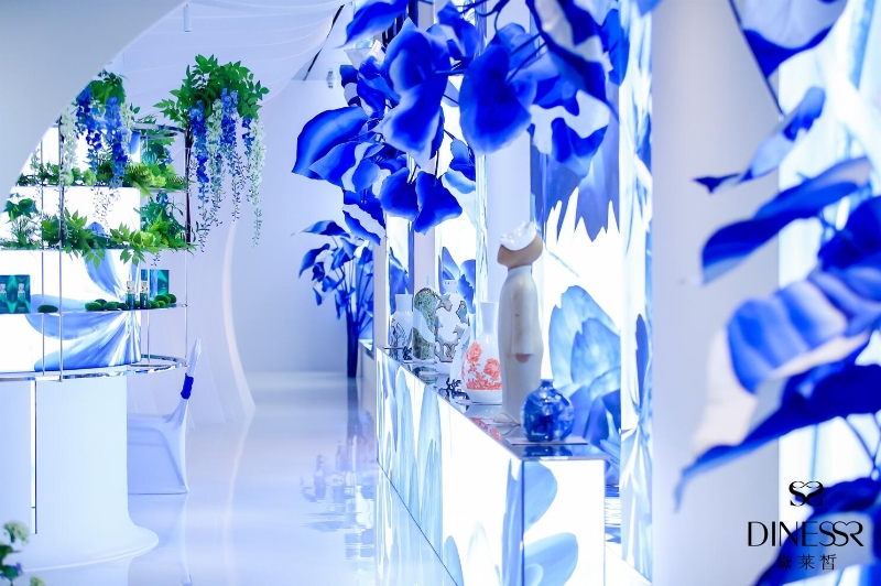 作為新銳國貨護膚品牌,黛萊皙旗艦店不局限于傳統(tǒng)護膚品門店的定義,而是著力打造一個品牌文化內(nèi)涵展演的空間,以“東方青花”為主題,演繹“科技新國風”的品牌美學觀點。店內(nèi)分為六大主題視覺區(qū),分別為:“鳳舞九天”、“深林神話”、“化繭成蝶”、“未來之種”、“瓷美之詩”、“宮廷雅奢”,六個區(qū)域共同組成了黛萊皙的品牌美學藝術陳列。主題展演在六大主題視覺區(qū)依次呈現(xiàn),活動形式包含視覺表演、陶藝體驗、護膚產(chǎn)品體驗等。