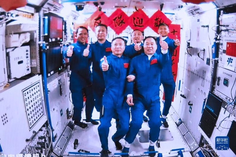 5月30日在北京航天飛行控制中心拍攝的神舟十五號航天員乘組與神舟十六號航天員乘組拍下“全家?!钡漠嬅?。