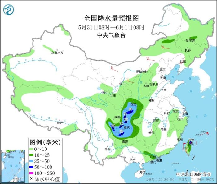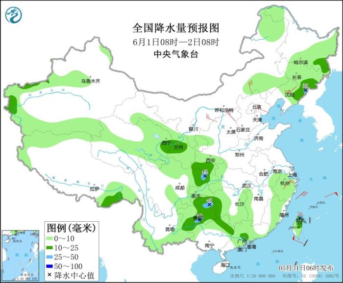 5月31日08時(shí)至6月1日08時(shí),西北地區(qū)東部、西南地區(qū)東部等地部分地區(qū)有中到大雨,陜西南部、四川盆地東部和南部、貴州西北部、臺(tái)灣島東北部等地部分地區(qū)有暴雨,其中,四川盆地、臺(tái)灣島東北部局地有大暴雨(100~120毫米)。內(nèi)蒙古、東北地區(qū)南部、浙江、福建沿海、臺(tái)灣島等地部分地區(qū)有4~6級(jí)風(fēng)。臺(tái)灣以東洋面將有9~11級(jí)風(fēng),陣風(fēng)12級(jí),東海南部海域、臺(tái)灣海峽、巴士海峽將有7~9級(jí)風(fēng),陣風(fēng)10級(jí)左右。
