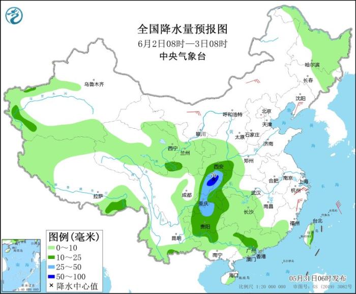 6月2日08時(shí)至3日08時(shí),西北地區(qū)東南部、西南地區(qū)東部等地部分地區(qū)有中到大雨,其中,陜西南部、四川盆地東北部、重慶北部等地部分地區(qū)有暴雨(50~70毫米)。內(nèi)蒙古中西部、遼東半島、浙江等地部分地區(qū)有4~5級(jí)風(fēng)。東海南部海域?qū)⒂?~8級(jí)風(fēng),陣風(fēng)9級(jí)。