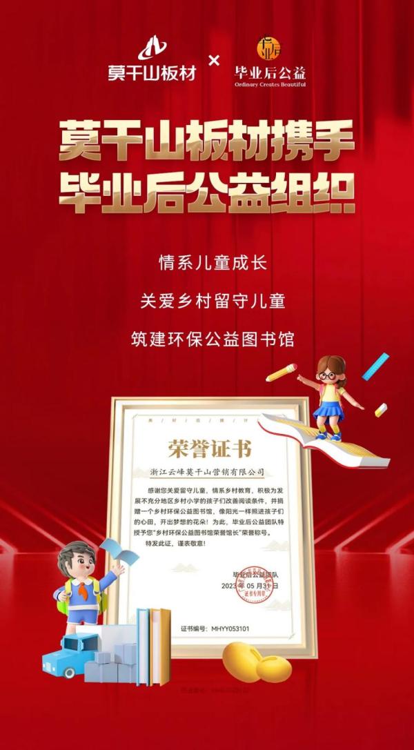 2023年6月1日,莫干山板材與畢業(yè)后公益組織達(dá)成協(xié)議,“2023莫干山板材ENF環(huán)保公益圖書館”項(xiàng)目全面啟動(dòng)。