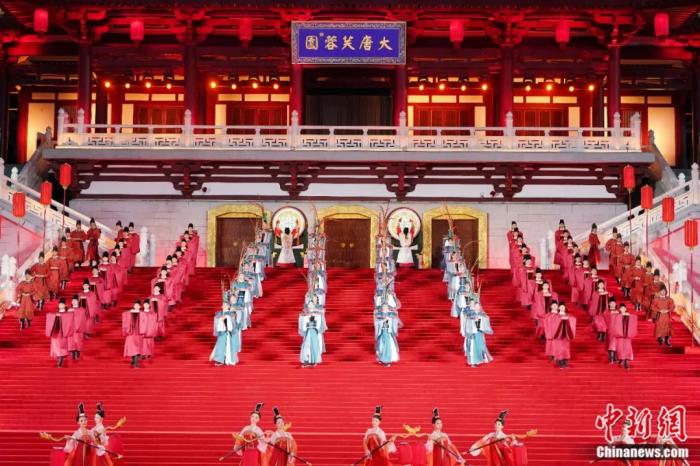 2023年5月18日晚,演員在陜西省西安市大唐芙蓉園舉行的歡迎儀式上表演,迎接出席中國(guó)-中亞峰會(huì)的貴賓。毛建軍 攝