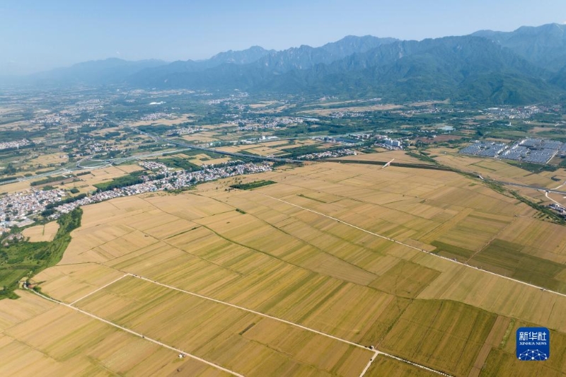 西安市長安區(qū)神禾塬萬畝優(yōu)質(zhì)糧食生產(chǎn)基地上陸續(xù)成熟的麥田(5月30日攝,無人機(jī)照片)。