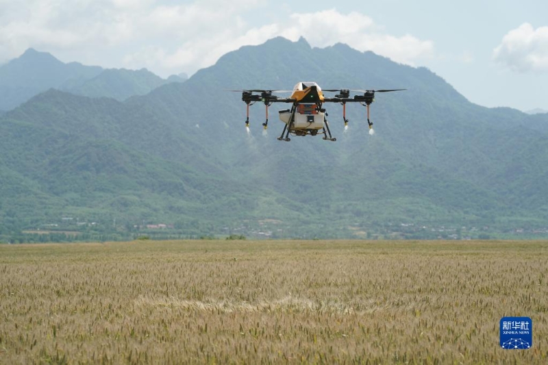 在西安市長安區(qū)神禾塬萬畝優(yōu)質(zhì)糧食生產(chǎn)基地,植保無人機(jī)進(jìn)行麥田植保作業(yè)(5月30日攝)。