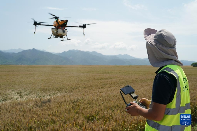 5月30日,西安市長安區(qū)長豐農(nóng)機(jī)專業(yè)合作社的飛手在操作植保無人機(jī)進(jìn)行植保作業(yè)。