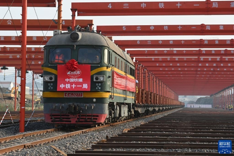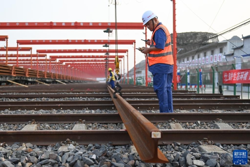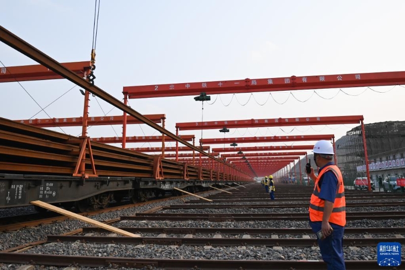 6月1日,中鐵十一局工程技術(shù)人員在杭溫鐵路義烏鋪軌基地堆碼500米長(zhǎng)鋼軌。