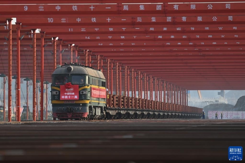 6月1日,載有長(zhǎng)鋼軌的首趟列車駛?cè)牒紲罔F路一期義烏鋪軌基地。