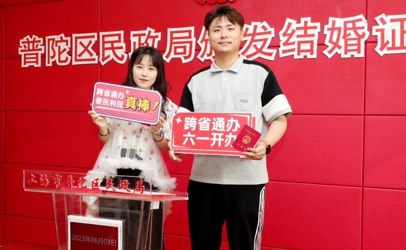 “我們5月下旬就在網(wǎng)上看到了可以‘跨省’辦理結(jié)婚登記的消息,預(yù)約通道一開放,就趕緊選擇了‘六一’這個日子,一是想快些領(lǐng)到‘紅本本’,二是覺得‘六一’寓意著要永遠(yuǎn)保持一顆童心?!痹谏虾J衅胀訁^(qū)婚姻收養(yǎng)登記中心現(xiàn)場,來自陜西的劉先生和姚女士開心地向記者分享著他們的喜悅。