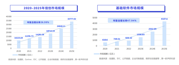 第一新聲指出,2023年信創(chuàng)產(chǎn)業(yè)市場(chǎng)規(guī)模預(yù)計(jì)為18710.59億元,到2025年為33777.02億元,復(fù)合增長(zhǎng)率達(dá)到26.99%,紅利將會(huì)持續(xù)到2027年前后。產(chǎn)業(yè)正在從關(guān)鍵環(huán)節(jié)、部分市場(chǎng)的“局部試點(diǎn)”,走向多環(huán)節(jié)、多行業(yè)的“全面覆蓋”。