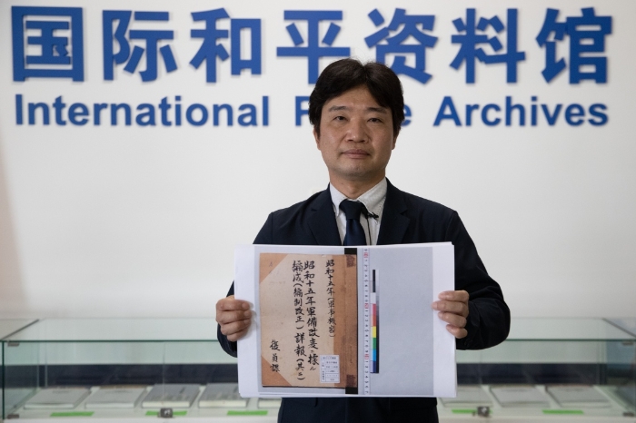 6月1日,在黑龍江外國語學(xué)院國際和平資料館,日本學(xué)者松野誠也展示新發(fā)現(xiàn)的資料。新華社記者 張濤 攝