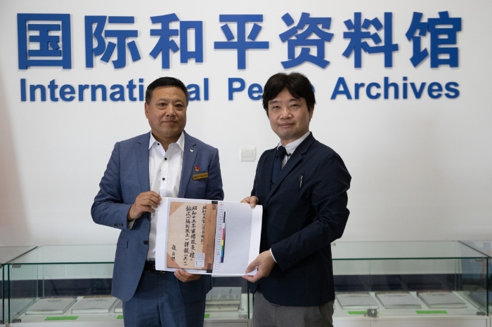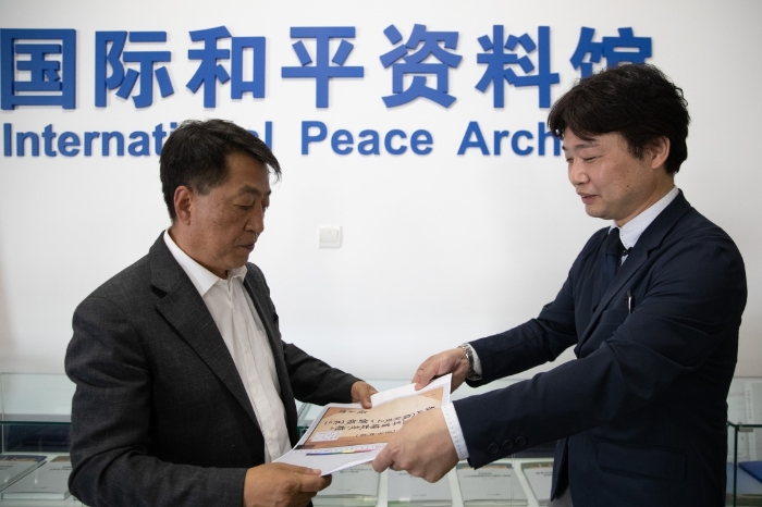 6月1日,日本學(xué)者松野誠也(右)將影印資料贈予侵華日軍第七三一部隊罪證陳列館館長金成民。新華社記者 張濤 攝