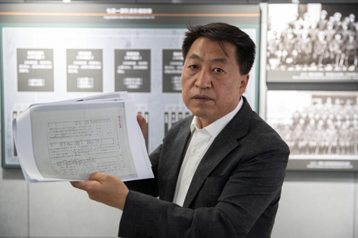 6月1日,在黑龍江外國語學(xué)院國際和平資料館,侵華日軍第七三一部隊罪證陳列館館長金成民展示新發(fā)現(xiàn)的資料。新華社記者 張濤 攝