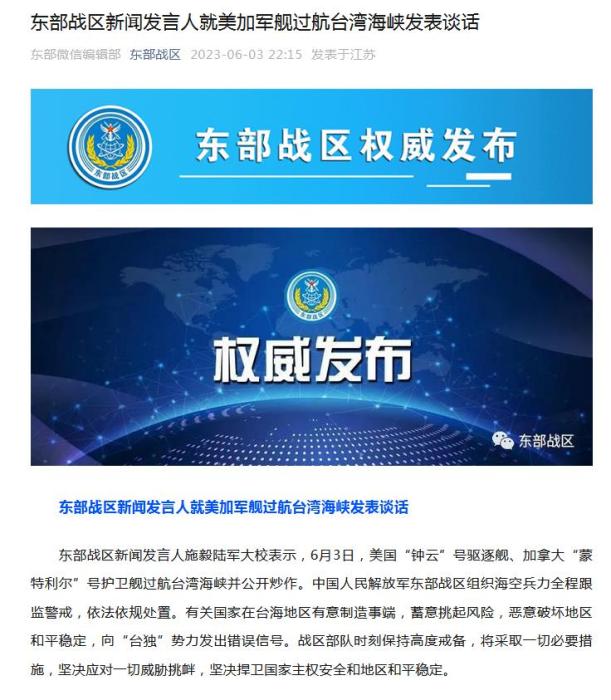 中新網(wǎng)6月3日電 據(jù)東部戰(zhàn)區(qū)微信公眾號(hào)消息,東部戰(zhàn)區(qū)新聞發(fā)言人施毅陸軍大校表示,6月3日,美國“鐘云”號(hào)驅(qū)逐艦、加拿大“蒙特利爾”號(hào)護(hù)衛(wèi)艦過航臺(tái)灣海峽并公開炒作。中國人民解放軍東部戰(zhàn)區(qū)組織海空兵力全程跟監(jiān)警戒,依法依規(guī)處置。有關(guān)國家在臺(tái)海地區(qū)有意制造事端,蓄意挑起風(fēng)險(xiǎn),惡意破壞地區(qū)和平穩(wěn)定,向“臺(tái)獨(dú)”勢(shì)力發(fā)出錯(cuò)誤信號(hào)。戰(zhàn)區(qū)部隊(duì)時(shí)刻保持高度戒備,將采取一切必要措施,堅(jiān)決應(yīng)對(duì)一切威脅挑釁,堅(jiān)決捍衛(wèi)國家主權(quán)安全和地區(qū)和平穩(wěn)定。