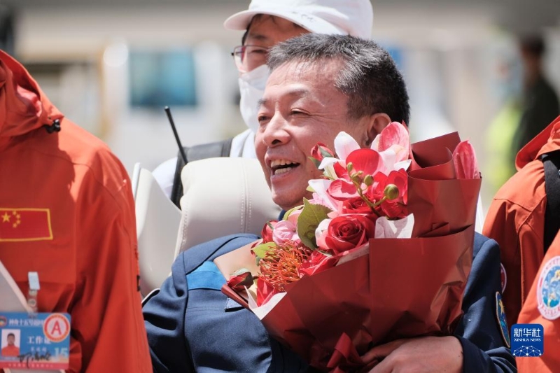 6月4日,神舟十五號航天員乘組平安抵京,航天員鄧清明手捧妻子為其送上的鮮花。新華社記者 李杰 攝