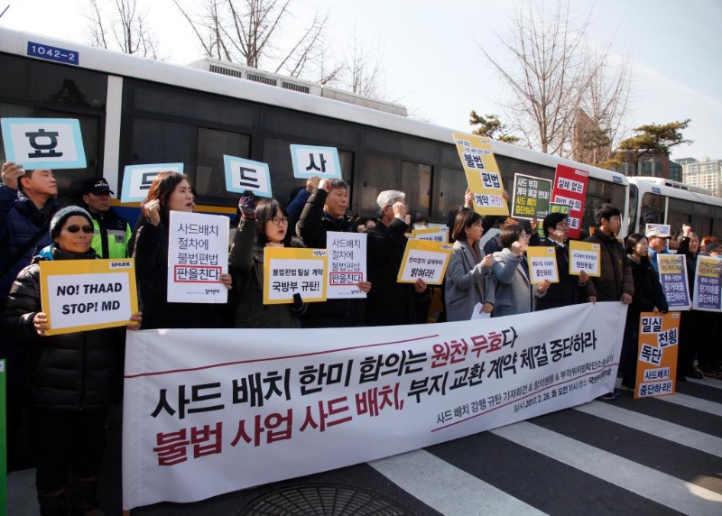 2017年2月28日,在韓國(guó)首爾的韓國(guó)國(guó)防部門前,韓國(guó)民眾高舉反對(duì)“薩德”系統(tǒng)的標(biāo)語。新華社記者 姚琪琳 攝