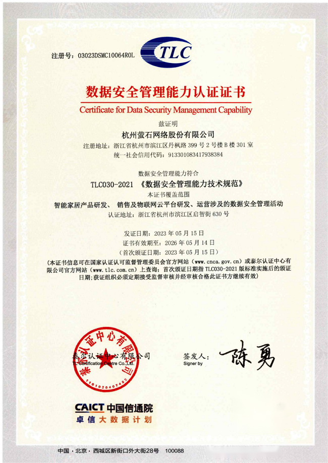 而想要落實(shí)守護(hù)生活安全,背后的企業(yè)技術(shù)安全不可或缺,安全體系構(gòu)建貫穿螢石網(wǎng)絡(luò)的發(fā)展歷程。截至目前,螢石網(wǎng)絡(luò)已經(jīng)通過ISO??27001、ISO 27017、CSA STAR 、ISO 27018、ISO 27701、ISO 29151、ISO??22301等主要標(biāo)準(zhǔn)體系,打造了業(yè)內(nèi)領(lǐng)先的信息安全管理體系和個(gè)人信息保護(hù)管理體系。近日,螢石網(wǎng)絡(luò)還通過了由中國信通院發(fā)起的數(shù)據(jù)安全領(lǐng)域國家級權(quán)威認(rèn)證——數(shù)據(jù)安全管理能力認(rèn)證(DSMC),成為智能家居行業(yè)首家獲證單位。