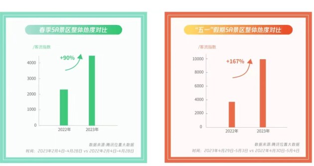 5月19日,在第十三個中國旅游日“旅游高質(zhì)量發(fā)展論壇”上,據(jù)《「春天里」的新文旅——后疫情時代文旅發(fā)展大數(shù)據(jù)報告》顯示,全國文旅市場全面復(fù)蘇,省域周邊游大熱,國家5A景區(qū)2023年春季整體熱度同比去年增長超90%,五一假期熱度同比去年增長167%。