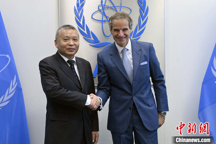 圖為張克儉會(huì)見(jiàn)國(guó)際原子能機(jī)構(gòu)總干事格羅西。 中新社發(fā) 中國(guó)常駐維也納代表團(tuán)供圖
