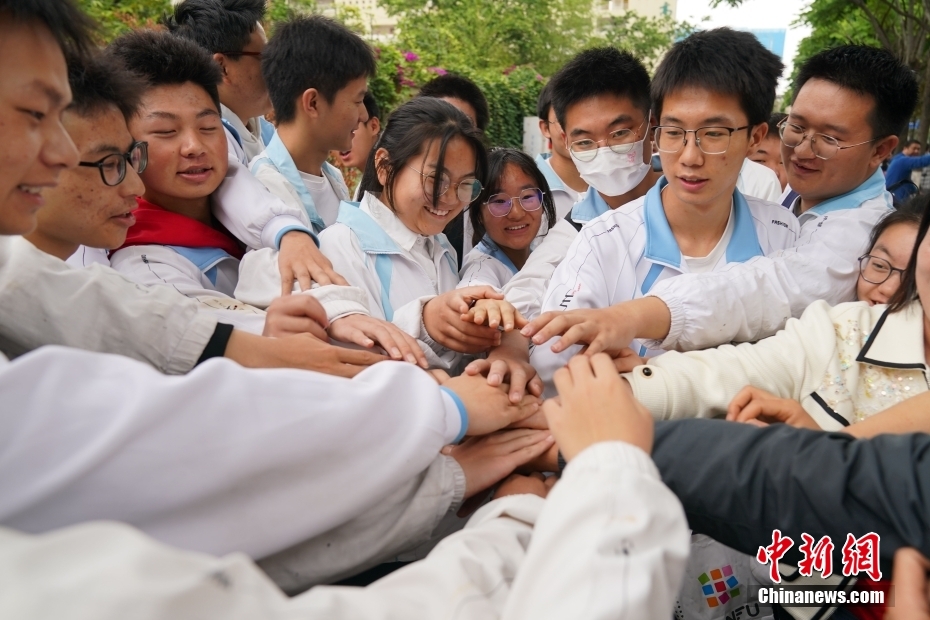 6月7日,云南省昆明市,考生們互相鼓勁加油。當(dāng)日,2023年全國高考拉開帷幕。中新社記者 劉冉陽 攝