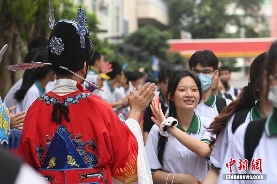 6月7日,廣東省廣州市海珠區(qū),考生走進(jìn)廣州市第六中學(xué)考點(diǎn),來自該校的學(xué)生穿著傳統(tǒng)服飾為考生加油打氣。當(dāng)日,2023年全國高考拉開帷幕。中新社記者 陳楚紅 攝