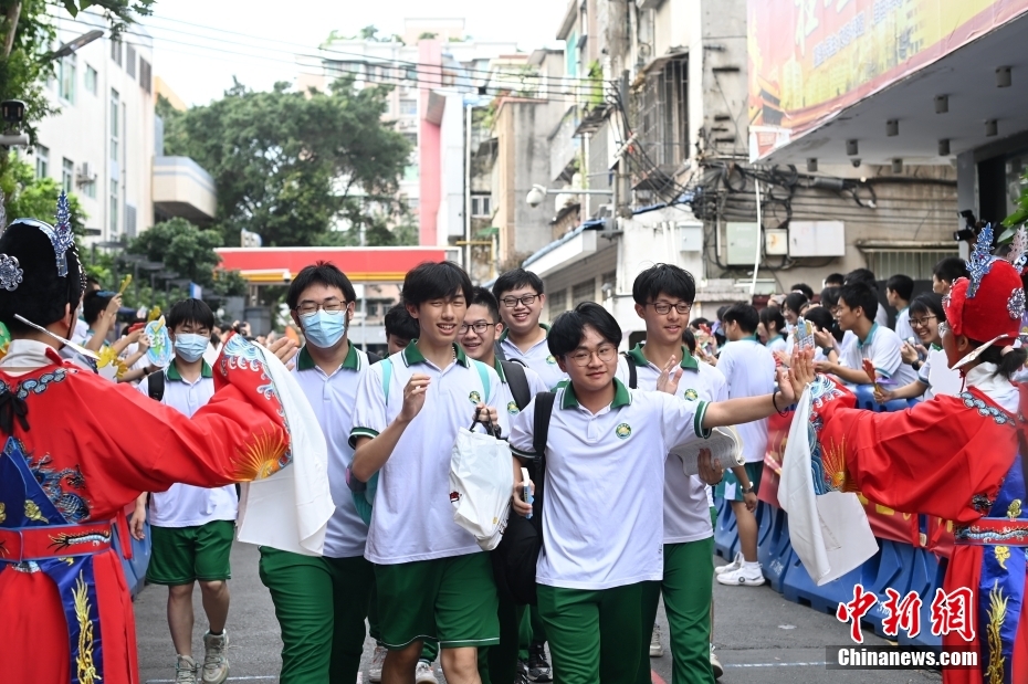6月7日,廣東省廣州市海珠區(qū),考生走進(jìn)廣州市第六中學(xué)考點(diǎn),來自該校的學(xué)生穿著傳統(tǒng)服飾為考生加油打氣。當(dāng)日,2023年全國高考拉開帷幕。 中新社記者 陳楚紅 攝