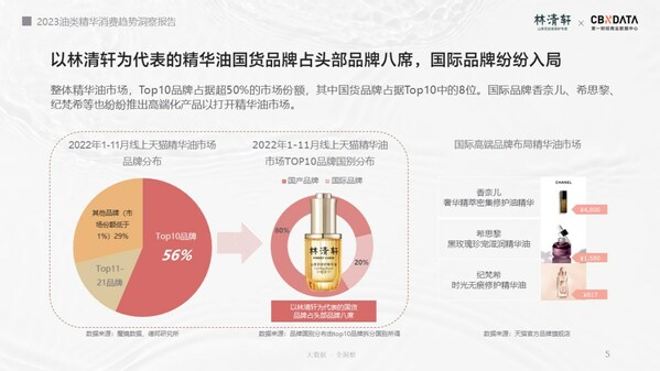 根據(jù)第一財經(jīng)商業(yè)數(shù)據(jù)中心的發(fā)布《2023油類精華消費趨勢洞察報告》中指出,精華油、以油養(yǎng)膚,以及"抗老精華油"的概念在小紅書、抖音等社交平臺的搜索指數(shù)不斷攀升,小紅書上"以油養(yǎng)膚"話題的瀏覽總量超過了1.2億,過去一年線上淘寶天貓及京東平臺精華油銷售額同比增速達64%。在國內(nèi)外品牌紛紛跟進推出油類護膚產(chǎn)品之際,林清軒憑借山茶花油的提前布局,借勢快速進入爆發(fā)期。