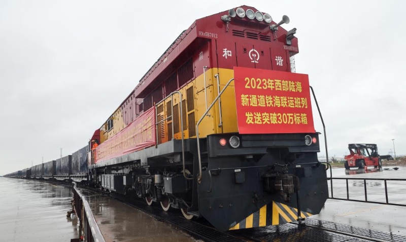 2023年5月11日,一列裝載東盟貨物的火車從廣西欽州鐵路集裝箱中心站開出,這標(biāo)志著西部陸海新通道鐵海聯(lián)運(yùn)貨物突破30萬標(biāo)箱。新華社記者 張愛林 攝