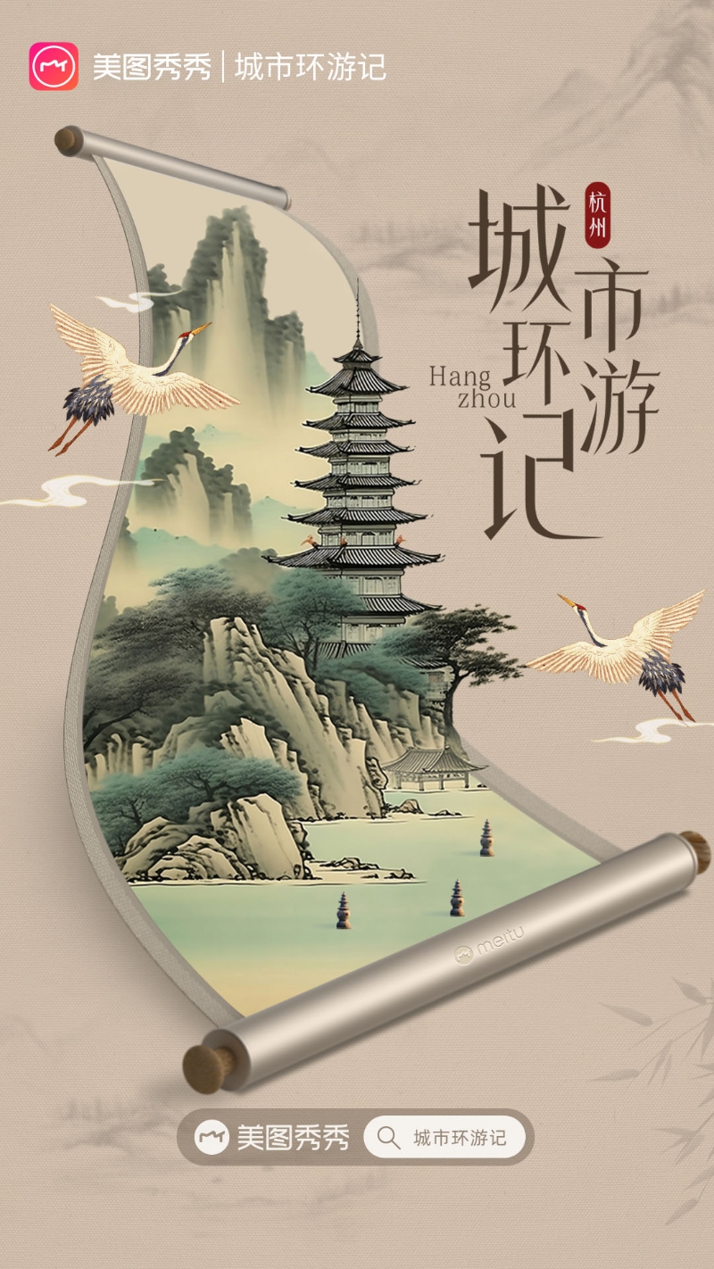 在「MT城市環(huán)游記」杭州篇的產(chǎn)品創(chuàng)意中,美圖秀秀選擇以杭州特色的宋韻文化作為基調(diào),將具有識別度和記憶點的尚“意”重“雅”的美學風格作為視覺呈現(xiàn)的主題,采用工筆畫的形式和極簡的色調(diào)元素,體現(xiàn)宋朝輕盈雅致的審美取向。