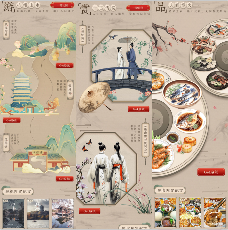 通過連接古今美學的文化脈絡,「MT城市環(huán)游記」杭州站將城市文化元素創(chuàng)意轉(zhuǎn)化,從“山水、千古傳說、美食”三個角度呈現(xiàn)宋韻文化在當下的生機。雷峰塔、靈隱寺等杭州文化地標、《白蛇傳》《梁山伯與祝英臺》等傳說佳話、東坡肉等特色杭州菜在本次企劃中被轉(zhuǎn)化成為美圖貼紙和限定美圖配方,在詩畫山水與人間煙火之中,再現(xiàn)宋韻杭州之美。