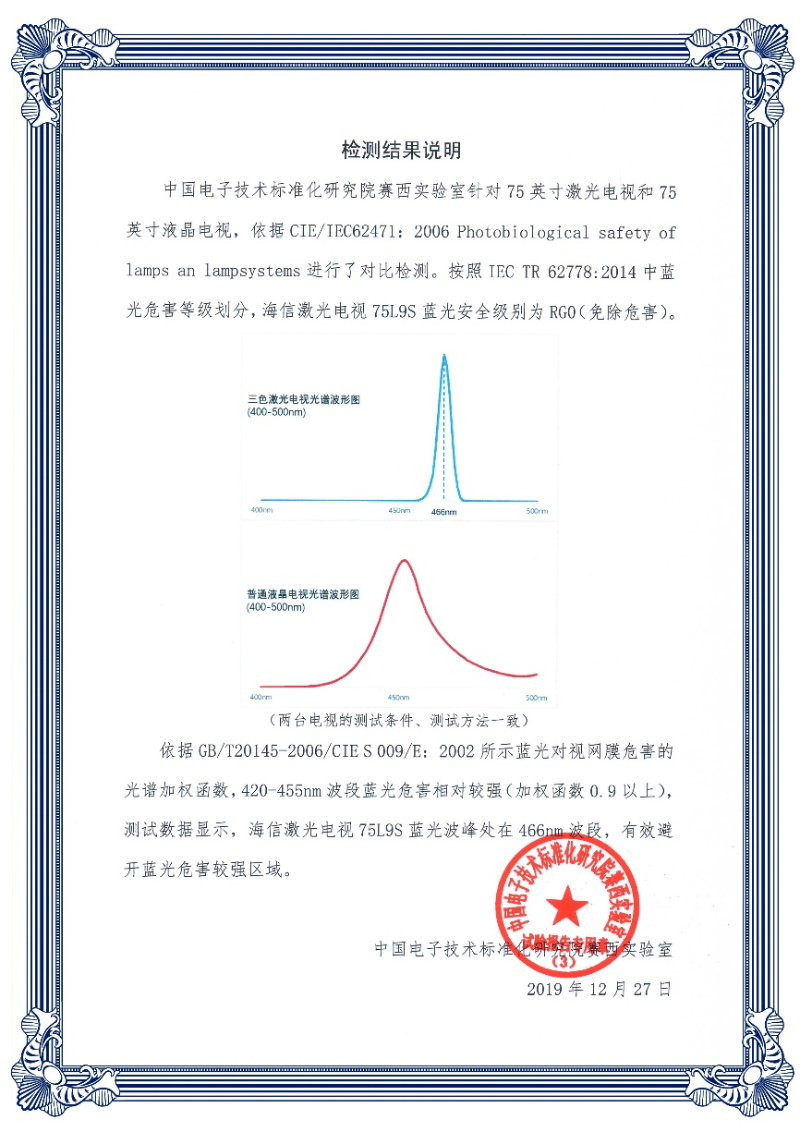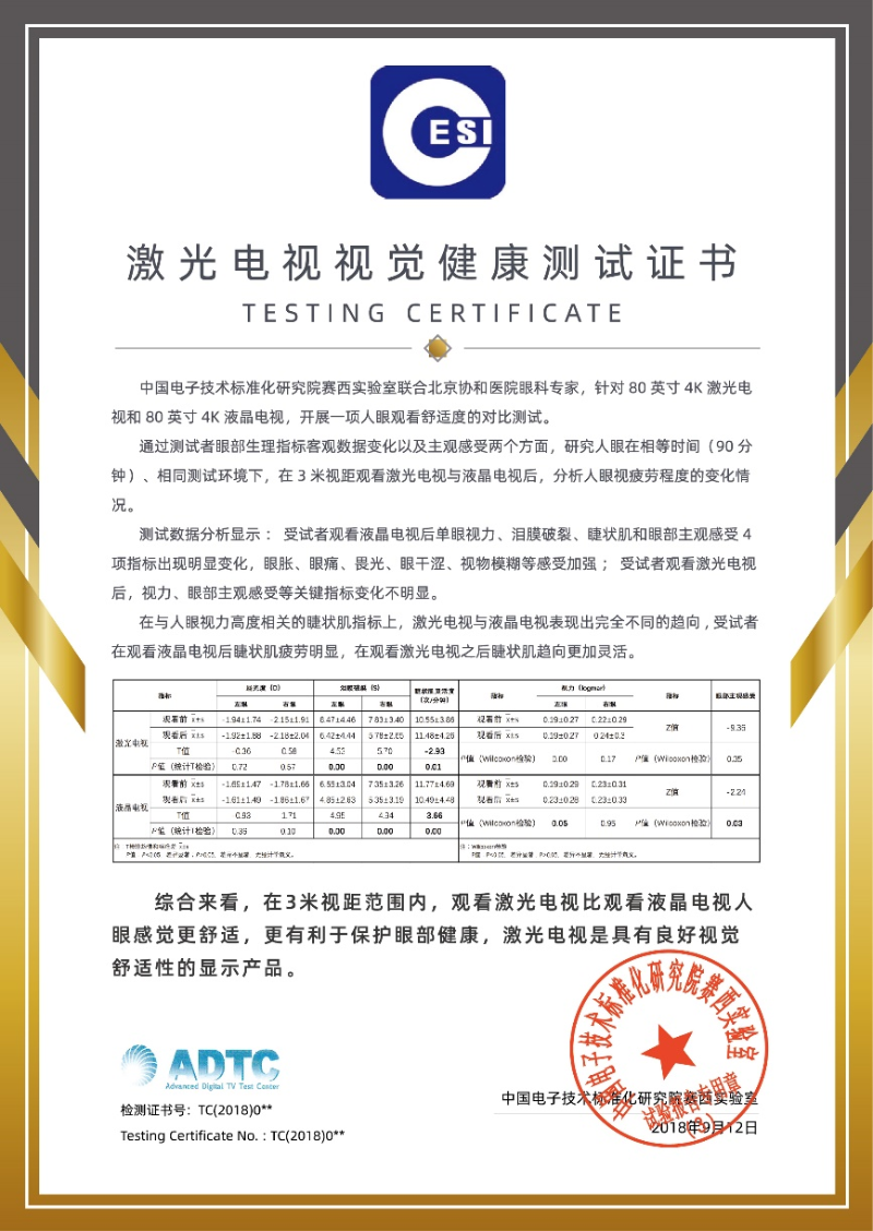 國家直屬權(quán)威檢測機構(gòu)中國電子技術(shù)標準化研究院賽西實驗室和北京協(xié)和醫(yī)院眼科專家,通過人群相同條件下觀看激光電視和液晶電視的嚴格對比試驗,測試數(shù)據(jù)分析顯示:受試者觀看液晶電視后單眼視力、淚膜破裂、睫狀肌和眼部主觀感受4項指標出現(xiàn)明顯變化,眼脹、眼痛、畏光、眼干澀、視物模糊等感受加強;受試者觀看激光電視后,視力、眼部主觀感受等關鍵指標變化不明顯。研究發(fā)現(xiàn):在3米視距范圍內(nèi),觀看激光電視比觀看液晶電視人眼感覺更舒適,更有利于保護眼部健康,激光電視是具有良好視覺舒適性的顯示產(chǎn)品。