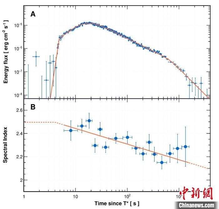 美國藝術與科學院院士、伽馬射線暴火球模型奠基人彼得·梅斯扎羅斯(Peter Meszaros)教授評價稱,得益于“拉索”巨大的觀測面積和先進的探測器技術,這是首次探測到萬億電子伏特(TeV)能區(qū)的早期余輝光變曲線,光變曲線顯示出減速特征,還觀測到光變曲線的截斷現(xiàn)象,相關計算結果與其他伽馬射線暴一致。