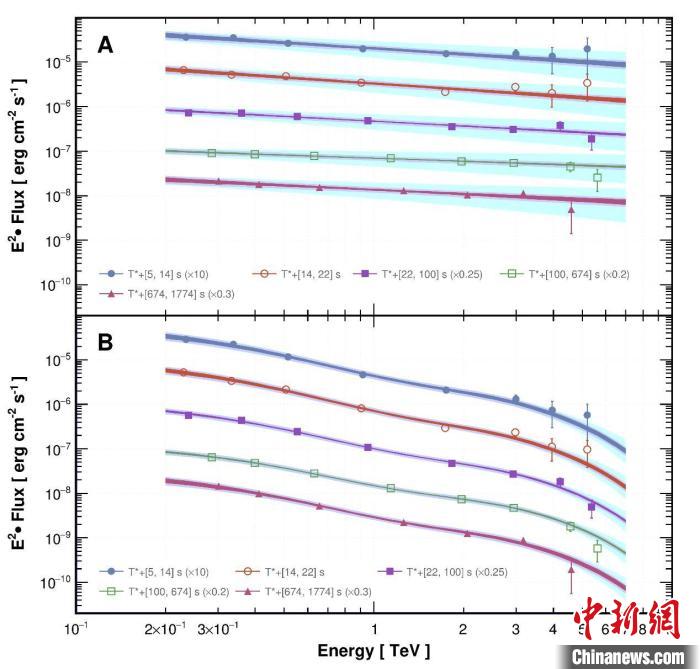 “拉索”測量得到的GRB221009A在5個時間段的本征譜與觀測譜,約在2千億到7萬億電子伏特之間。 中科院高能所 供圖