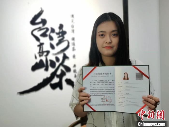 2023年6月,蔡如瑜展示她在大陸考取的中級茶藝師職業(yè)技能等級證書?!≈行律缬浾?鐘升 攝