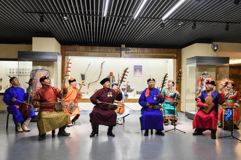在赤峰博物館,《格薩(斯)爾》國家級非遺傳承人金巴扎木蘇(前排右二)和團隊一起表演節(jié)目。新華社記者 劉磊 攝