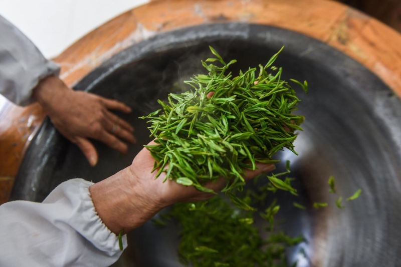 在杭州市西湖風(fēng)景名勝區(qū)滿覺隴村的中國茶葉博物館滿覺隴炒茶中心內(nèi),茶農(nóng)在手工炒制西湖龍井茶。新華社記者 徐昱 攝