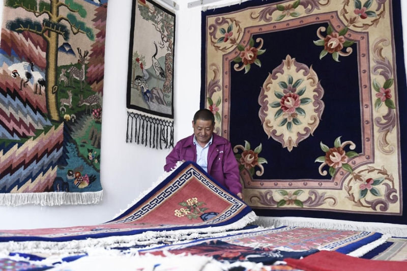 在西寧市湟中縣上新莊鎮(zhèn)加牙村,楊永良在整理制作好的藏毯。 新華社記者 張龍 攝