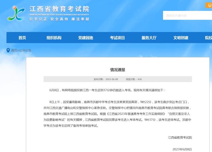 8日上午,因受暴雨影響,南昌市洪都中學(xué)考點(diǎn)考生涂某某受困高架,9時(shí)22分,該考生跑步到達(dá)考點(diǎn)門口,并向江西交通廣播電臺和交警指揮中心緊急求助。交警指揮中心把情況向南昌市教育考試院高考聯(lián)合指揮部反映,南昌市教育考試院上報(bào)江西省教育考試院。根據(jù)《江西省2023年普通高考考務(wù)工作實(shí)施細(xì)則》“自然災(zāi)害及非人為因素影響考試”的有關(guān)精神,江西省教育考試院同意該考生進(jìn)入考場考試。9時(shí)37分,該考生進(jìn)場考試。洪都中學(xué)考點(diǎn)為該考生啟用了備用考場單獨(dú)考試。