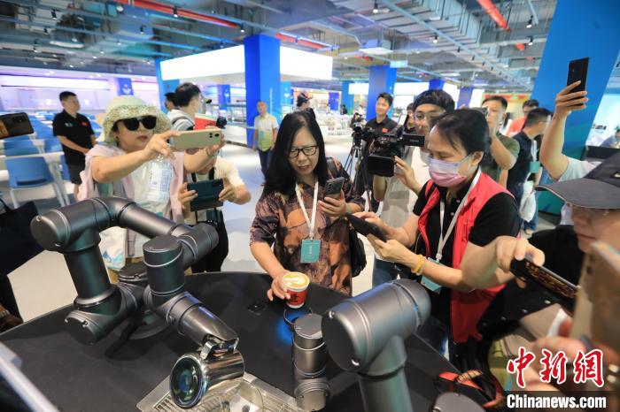 “行走中國·2023海外華文媒體看大運”活動走進(jìn)成都大運村運動員餐廳,海外華媒體驗智能咖啡機(jī)器人?!⊥趵?攝