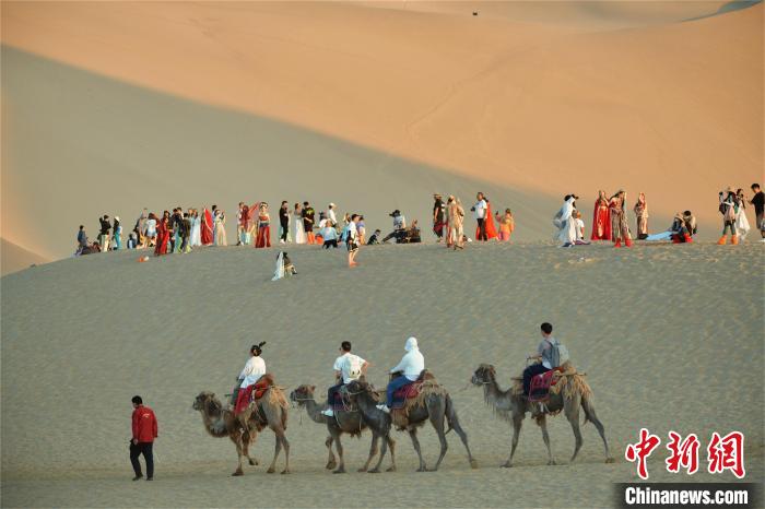 6月以來,在“人流如潮、駝隊如龍”的敦煌大漠里,很多敦煌舞愛好者涌向敦煌,穿上以飛天服飾為代表的各種古裝,在絲綢之路旅游網(wǎng)紅“打卡地”鳴沙山月牙泉、玉門關、陽關等景區(qū)拍照、直播,各種不同的古裝服飾也為“大漠孤煙直”的絲路古道增添了無限色彩。