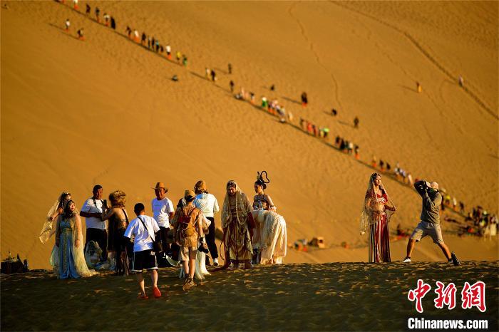 2023年6月7日,游客身著特色服飾和自己的旅拍團隊在鳴沙山上拍攝敦煌旅拍紀念照?!⊥醣筱y 攝