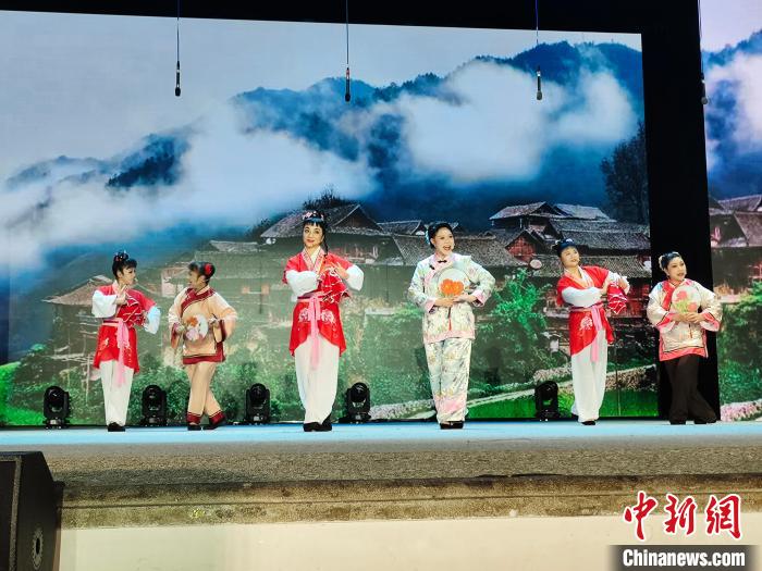 圖為廣西“80后”彩調(diào)演員賴丹丹(左三)在表演彩調(diào)劇《王三打鳥(niǎo)》片段?!↑S艷梅 攝