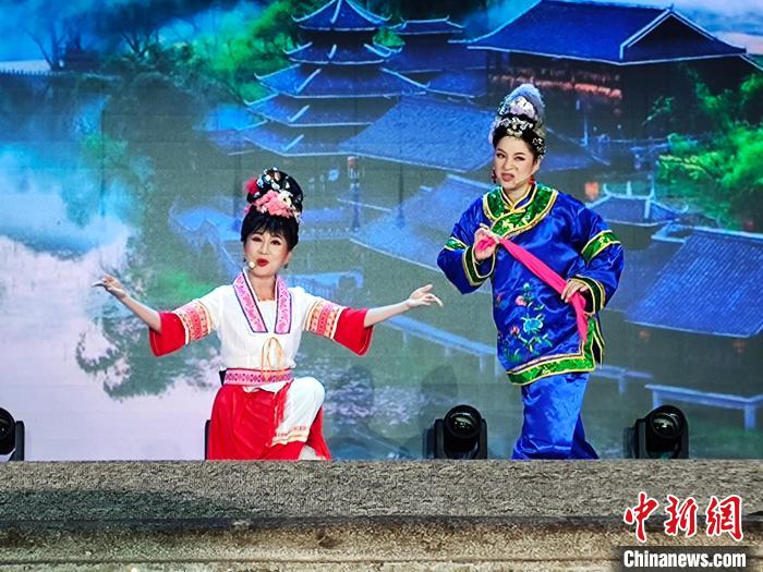 圖為廣西“90后”彩調(diào)演員何佳姿(左)在表演彩調(diào)劇《劉三姐》選段《戲媒》?!↑S艷梅 攝