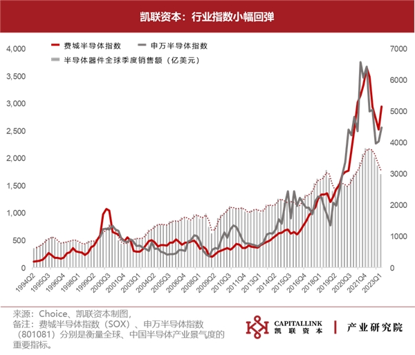 自2022 Q4費城半導(dǎo)體及申萬半導(dǎo)體指數(shù)雙雙觸底后,2023 Q1出現(xiàn)明顯回彈跡象,其中費城半導(dǎo)體指數(shù)環(huán)比上漲17%至2955點,申萬半導(dǎo)體指數(shù)環(huán)比上浮11%至4499點。雖然全球半導(dǎo)體器件季度銷售額仍未止跌,但是指數(shù)表現(xiàn)相較產(chǎn)業(yè)銷售數(shù)據(jù)而言更加具備實時性及前瞻性且指數(shù)表現(xiàn)與半導(dǎo)體產(chǎn)業(yè)發(fā)展周期呈相互呼應(yīng)態(tài)勢。行業(yè)指數(shù)的上行提前發(fā)出筑底復(fù)蘇信號。