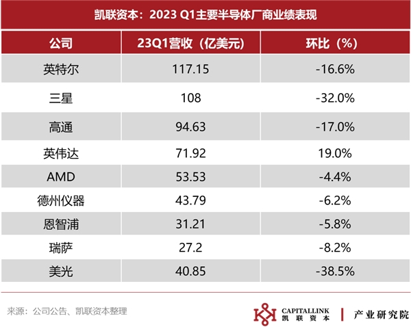 截取多家半導(dǎo)體廠商23 Q1營收數(shù)據(jù)顯示,半導(dǎo)體行業(yè)整體業(yè)績低迷,但細分領(lǐng)域分化顯著。英偉達受益于Chatgpt帶來的AI浪潮,在一眾負增長廠商中脫穎而出,實現(xiàn)65億美元營收,環(huán)比增長8.4%。相反,美光、三星等存儲大廠成為重災(zāi)區(qū),營收環(huán)比下降超30%。英特爾、高通等廠商受到終端市場需求疲軟影響,業(yè)績表現(xiàn)不佳。