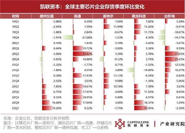 結(jié)合行業(yè)頭部芯片企業(yè)庫存水位變化數(shù)據(jù)來看,受益于汽車、工業(yè)下游市場需求穩(wěn)步增長,德州儀器庫存水位繼續(xù)保持增長態(tài)勢,23 Q1庫存周轉(zhuǎn)天數(shù)為179天,環(huán)比上升45天,季度存貨環(huán)比上升19%。